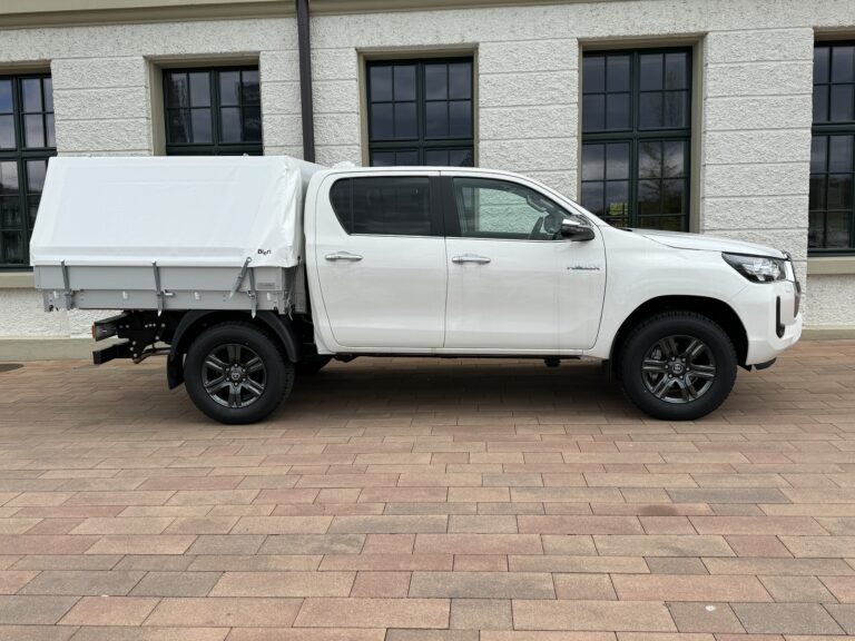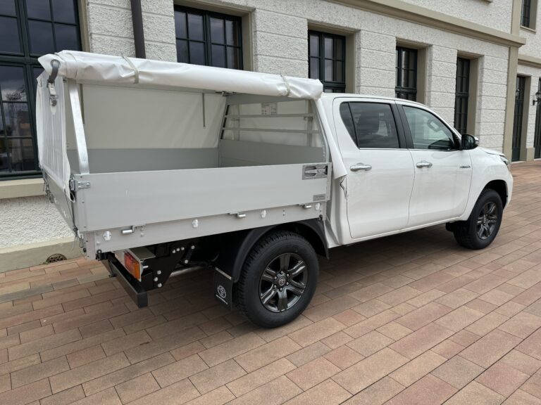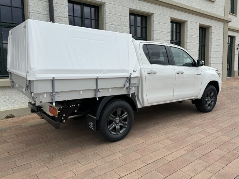 Als kleinere Alternative zu Koffer- und Kastenaufbauten bieten wir Blachengestelle für Pick-ups und Pritschenfahrzeuge an. Dabei wird der Unterbau mit Längs- und Querträgern aus Aluminium gewichtsoptimiert verstärkt. Zudem ist das Gestell oben, an dem die Blache befestigt wird, ebenfalls aus leichtem, hochfestem Aluminium. Für maximale Funktionalität lassen sich Blache und Ladeklappen nach drei Seiten hin öffnen. Die Verzurrösen für die Blache befinden sich unterhalb der Ladeklappen, wodurch die Verschlüsse der Ladeklappen durch die Blache vor äusseren Einflüssen geschützt sind.