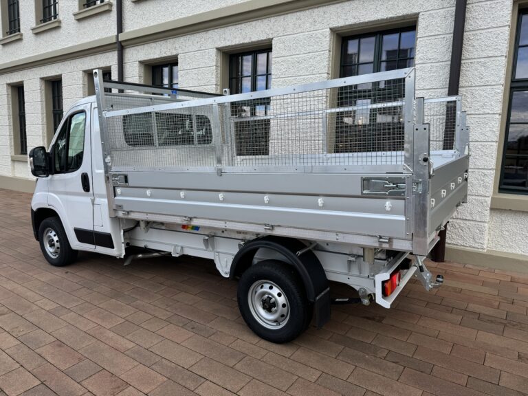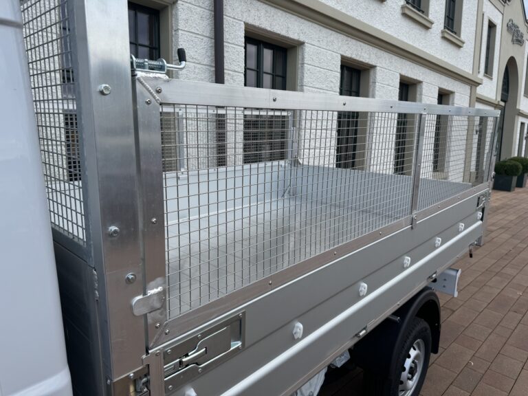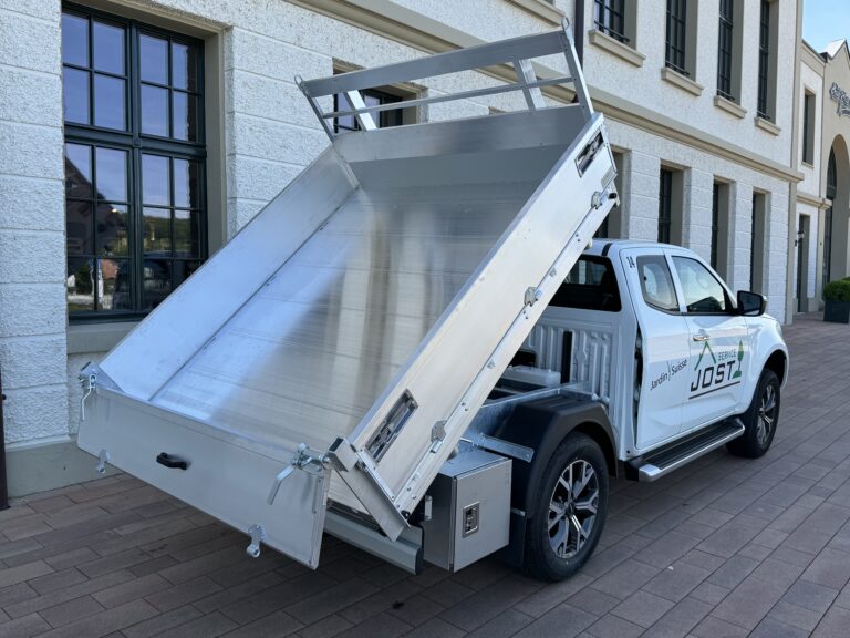 Nach hinten, rechts oder links – unsere 3-Seitenkipper bieten Ihnen grösste Flexibilität bei maximaler Sicherheit und Solidität. Dabei sind Ausführungen mit unterschiedlichem Zubehör wie Stangenträger, Binderinge und Werkzeugkisten machbar. Die Befestigungshaken für Transportnetze werden aussen montiert und sind Standard. Die Stirnwand überragt die Kabine um ca. 50 mm und ein Gitter im Fensterbereich sorgt für mehr Sicherheit. Je nach Fahrzeugmarke und -modell nehmen wir auch eine Chassis-Verstärkung vor.